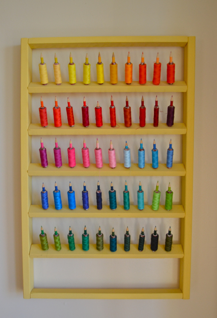 Recently, my father and I collaborated to create an awesome rainbow thread organizer. This project was inspired by this beautiful Rainbow Spool Rack from Robidou: